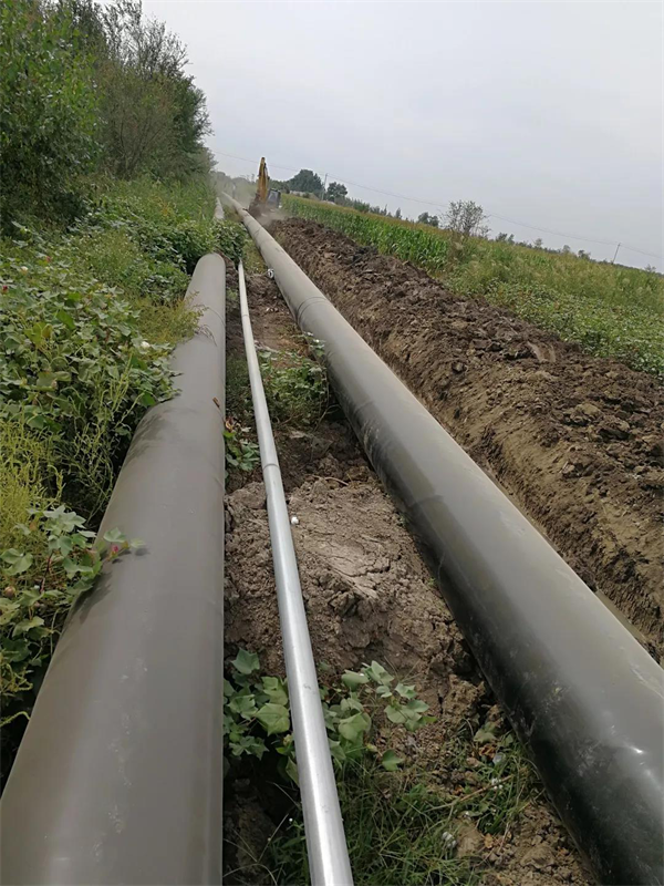 穿過一片棉花地, 樹林,S彎到穿越河流和馬路,然后連接上開挖的管道, 將近1000米左右。
