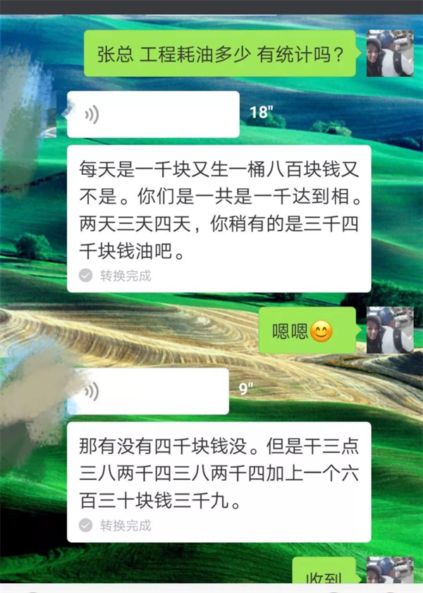 大家最關心的是成本的核算, 這樣一趟活兒下來, 究竟花了多少燃油? 看客戶的回復。