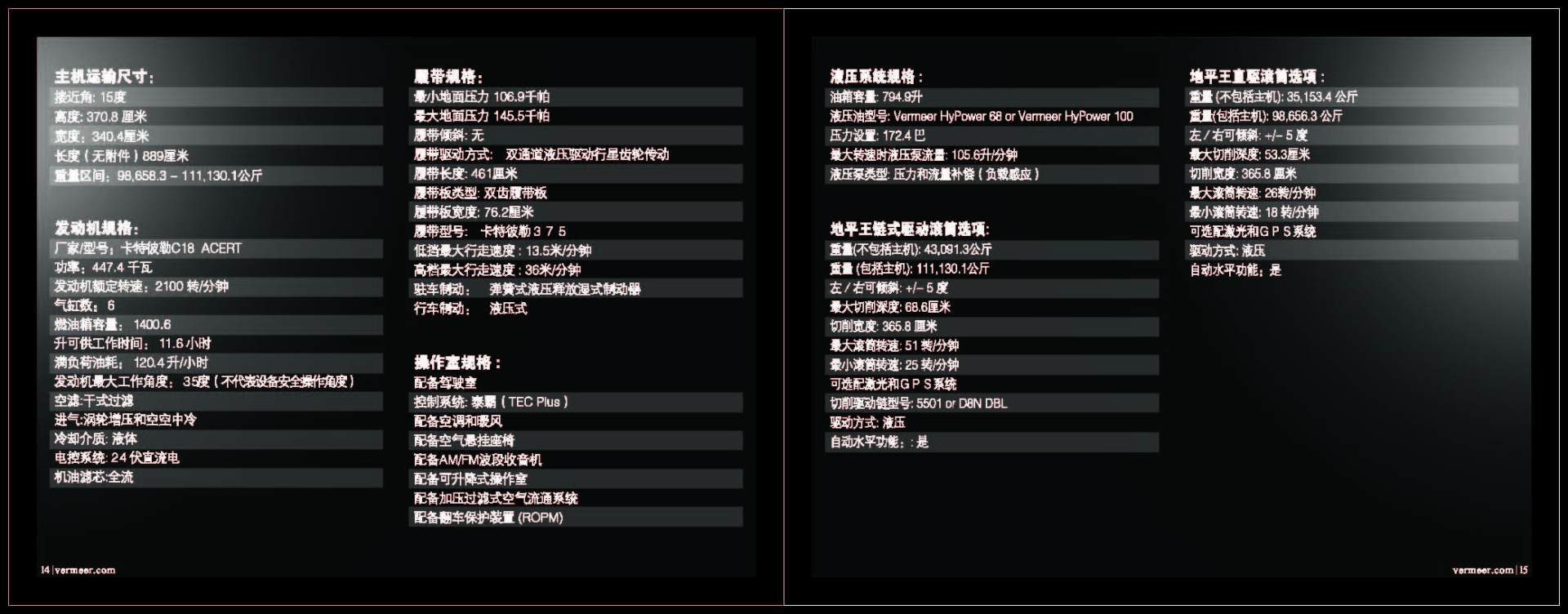 廠商和型號(hào) 卡特彼勒 (Caterpillar) C18 ACERT Tier 4 Final 總功率 600 hp 447.4 kw 發(fā)動(dòng)機(jī)額定轉(zhuǎn)速 2000 汽缸數(shù) 6 油箱容量 370 gal 1400.6 L 操作范圍 12.1 滿(mǎn)負(fù)荷時(shí)的耗油量 30.5 gph 115.5 lph 發(fā)動(dòng)機(jī)最大工作角度(發(fā)動(dòng)機(jī)工作角度并不表示安全的機(jī)器工作角度) 35 deg 空氣濾清器 帶預(yù)過(guò)濾器的干式濾清器 進(jìn)氣方式 渦輪增壓氣對(duì)氣后冷卻 冷卻介質(zhì) 液體 電氣系統(tǒng) 24 伏直流 機(jī)油濾清器 滿(mǎn)流 履帶